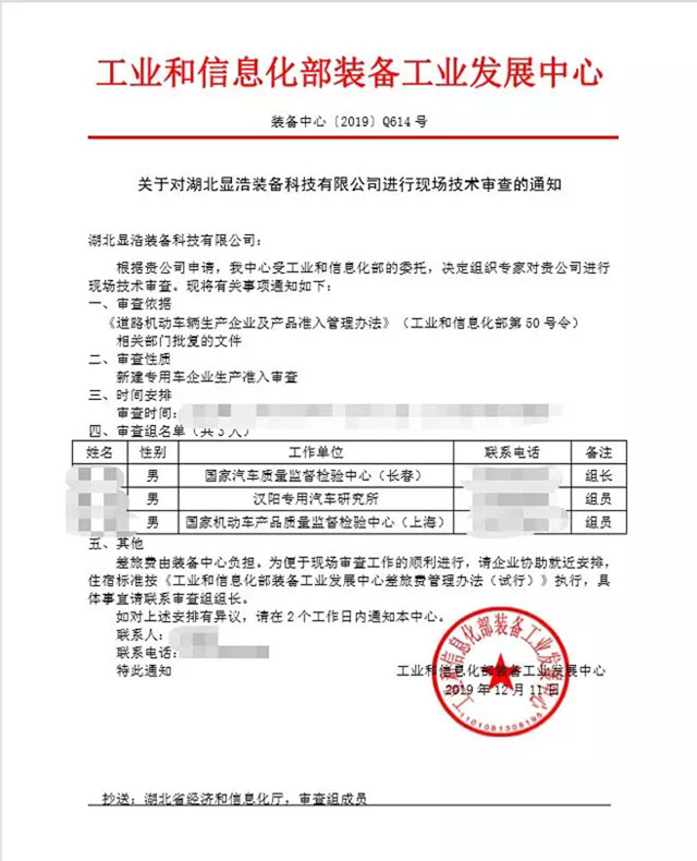 2019年12月19日湖北省顯浩裝備科技有限公司迎來了工信部委派的三位技術(shù)審查專家,三位專家對顯浩申請的專用車企業(yè)準(zhǔn)入進(jìn)行現(xiàn)場技術(shù)審查。依據(jù)《道路機(jī)動車輛生產(chǎn)企業(yè)及產(chǎn)品準(zhǔn)入管理辦法》(工業(yè)和信息化部第50號令)經(jīng)過三天的嚴(yán)格審查。專家對顯浩在送血車、檢測車、監(jiān)測車、冷藏車等專用車的研發(fā)、生產(chǎn)、銷售、售后服務(wù)等能力方面給予高度認(rèn)可,并一次性通過了現(xiàn)場審查。隨后將審查情況及材料匯報(bào)國家工信部專家組審查。