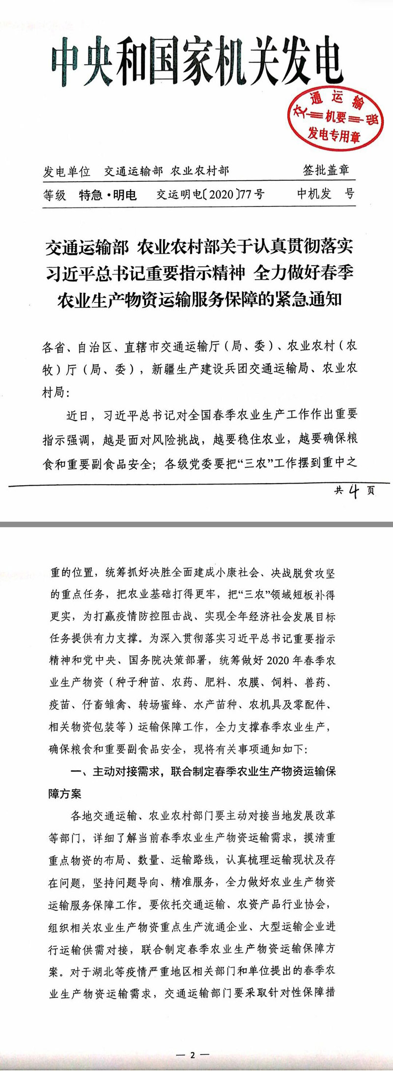 2月26日,交通運輸部、農(nóng)業(yè)農(nóng)村部聯(lián)合印發(fā)緊急通知,要求各地交通運輸、農(nóng)業(yè)農(nóng)村部門認(rèn)真貫徹落實習(xí)近平總書記關(guān)于全國春季農(nóng)業(yè)生產(chǎn)工作的重要指示精神,按照黨中央、國務(wù)院決策部署,統(tǒng)籌做好2020年春季農(nóng)業(yè)生產(chǎn)物資(種子種苗、農(nóng)藥、肥料、農(nóng)膜、飼料、獸藥、疫苗、仔畜雛禽、轉(zhuǎn)場蜜蜂、水產(chǎn)苗種、農(nóng)機具及零配件、相關(guān)物資包裝等)運輸保障工作,全力支撐春季農(nóng)業(yè)生產(chǎn),確保糧食和重要副食品安全。