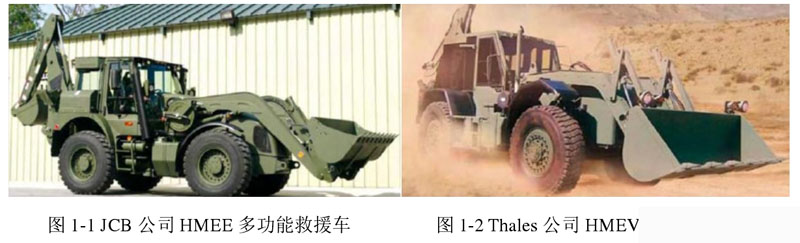 當(dāng)今世界范圍內(nèi),英美日澳等發(fā)達(dá)國(guó)家研制的多功能緊急救援車處于業(yè)內(nèi)較為領(lǐng)先的地位,其中較為典型的如圖1所示英國(guó)JCB公司為美軍設(shè)計(jì)開發(fā)的HMEE(High Mobility Engineer Excavator),是一種高機(jī)動(dòng)多功能挖掘機(jī),該機(jī)型一般用于戰(zhàn)場(chǎng)挖掘任務(wù)和戰(zhàn)場(chǎng)救援,能夠配備液壓錘、鏟斗、挖斗等作業(yè)工具,底盤系統(tǒng)采用多模式空氣懸掛系統(tǒng),可保證高速行駛平順性和正常作業(yè);采用全輪驅(qū)動(dòng)能夠應(yīng)對(duì)各種復(fù)雜地形,具有全輪轉(zhuǎn)向/蟹行轉(zhuǎn)向功能,為避免車輛喪失機(jī)動(dòng)性,車輛利用高強(qiáng)度輪胎,能在面積狹小的場(chǎng)合實(shí)施作業(yè),能夠由飛機(jī)進(jìn)行遠(yuǎn)距離運(yùn)輸以實(shí)現(xiàn)快速移動(dòng)。另外,澳大利亞 Thales 公司為美軍設(shè)計(jì)的 HMEV(High Mobility Engineering vehicle)與 HMEE 相類似,如圖 2 所示,同為較典型的高機(jī)動(dòng)多功能緊急救援車。